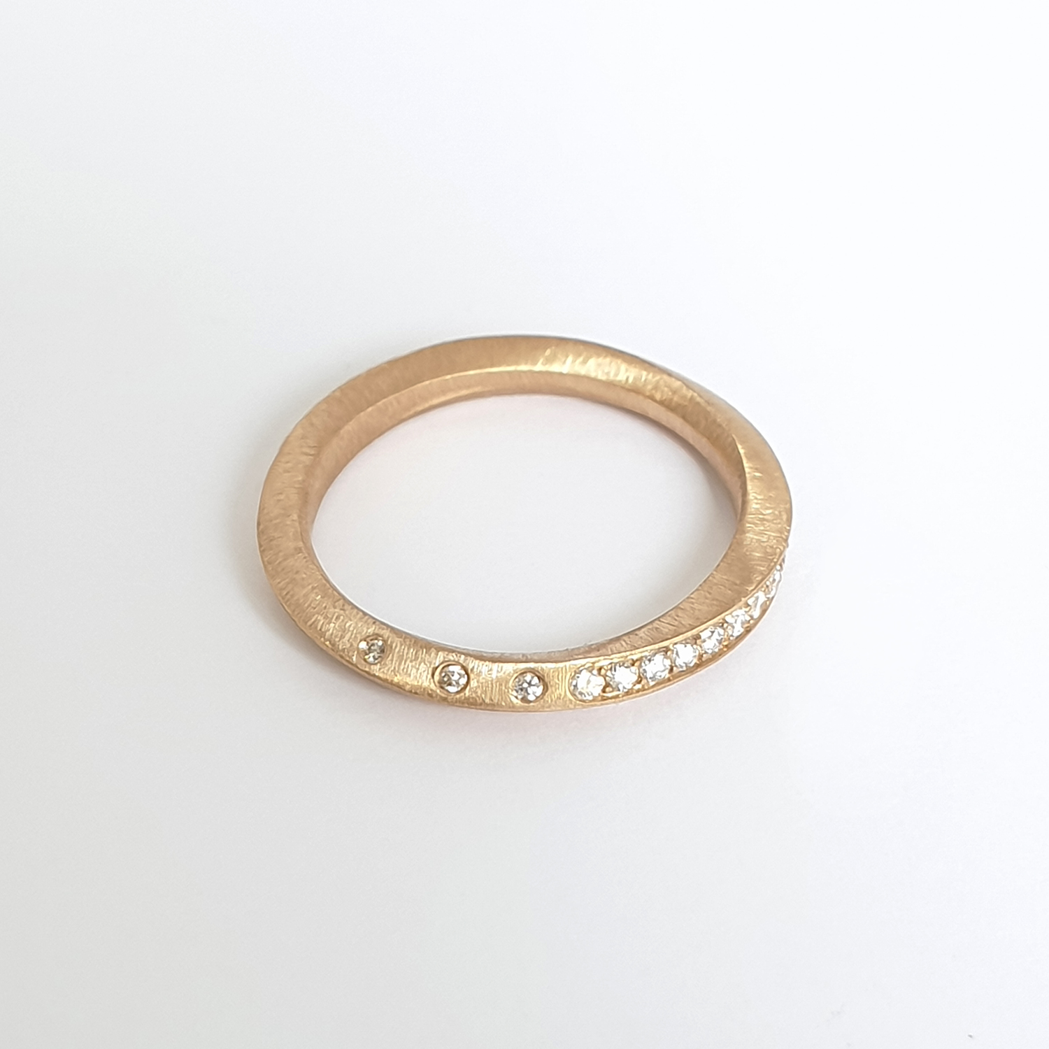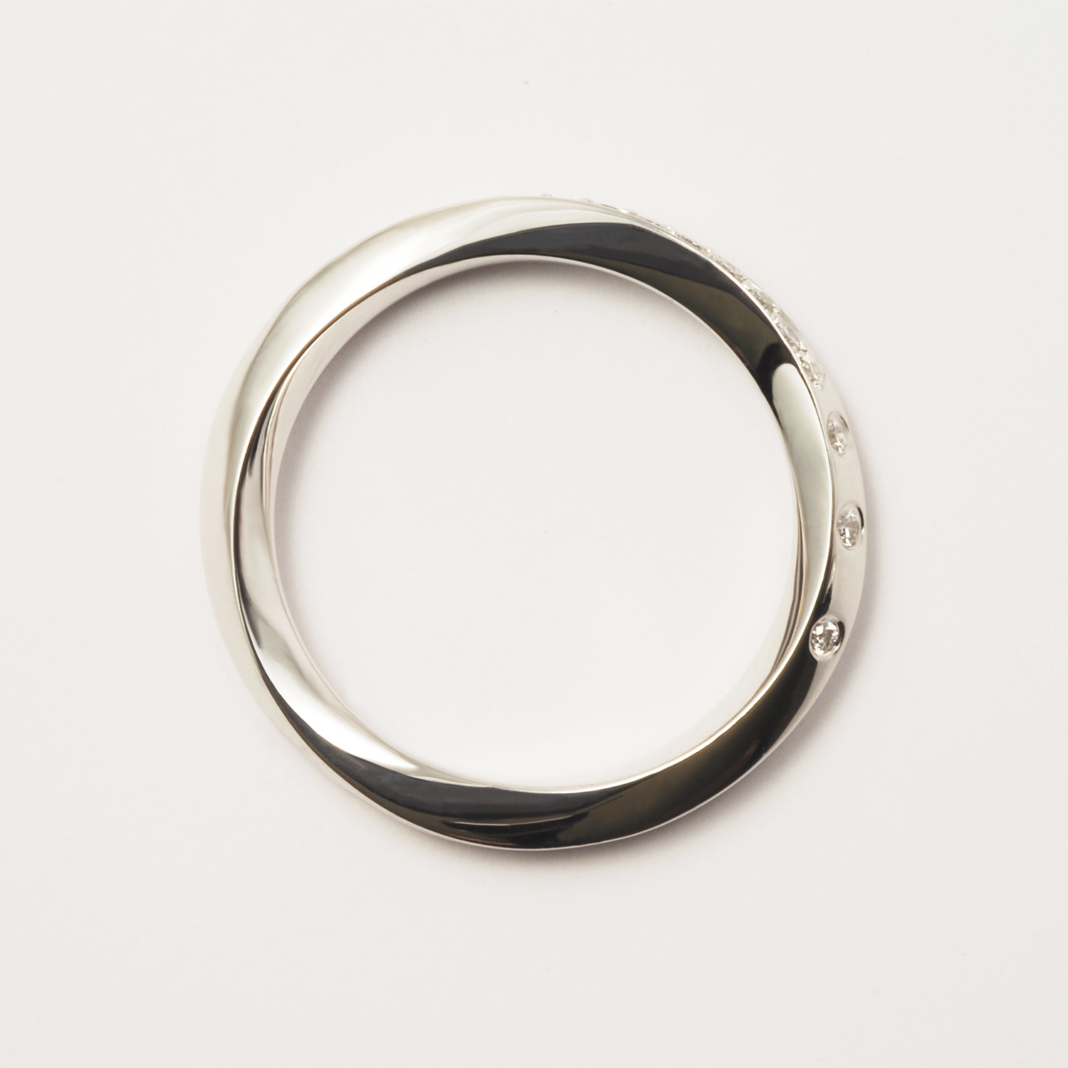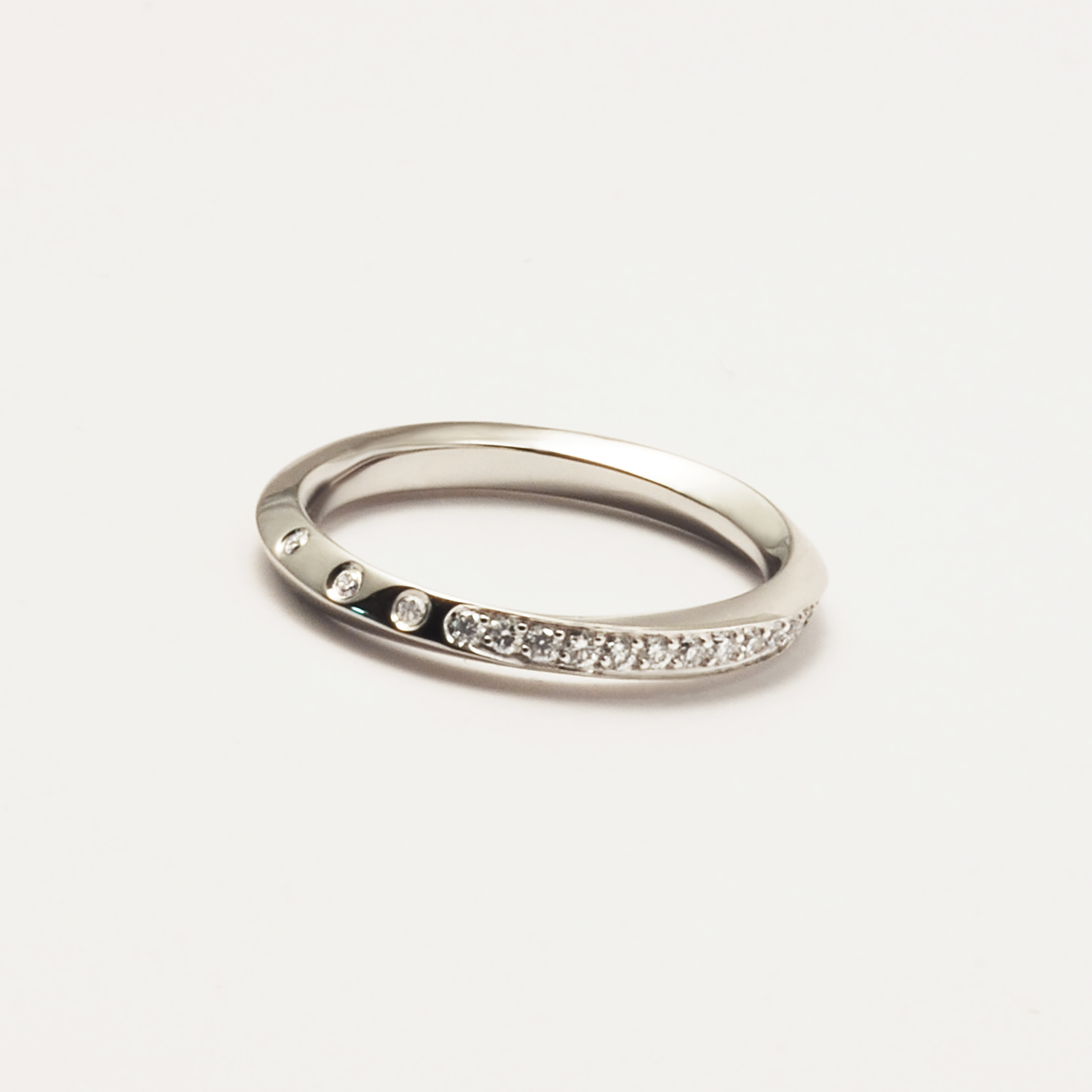 Une alliance au design épuré, inspiré des formes mathématiques impossibles. Un ruban carré qui vrille sur lui-