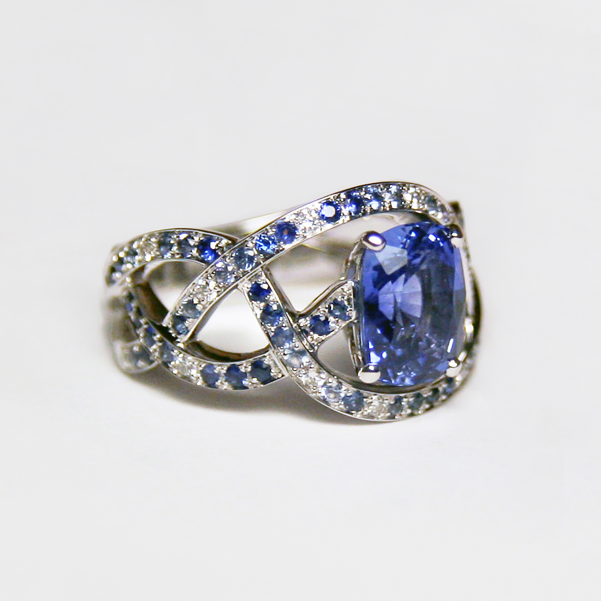 Or blanc 750/1000, saphir coussin 2.54 ct et pavage saphir et diamant