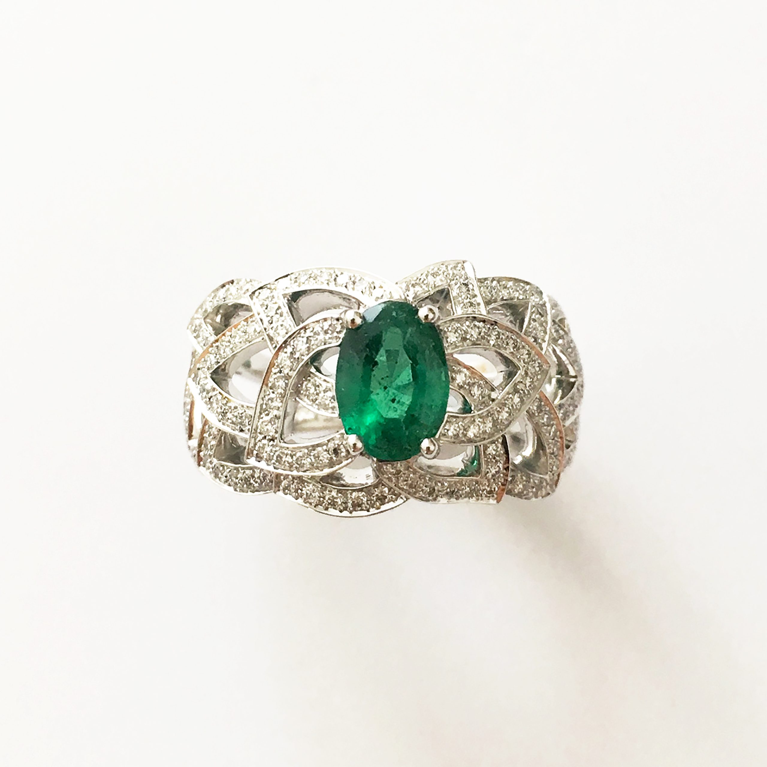 Or blanc 750/1000, émeraude 1.19ct et pavage diamant