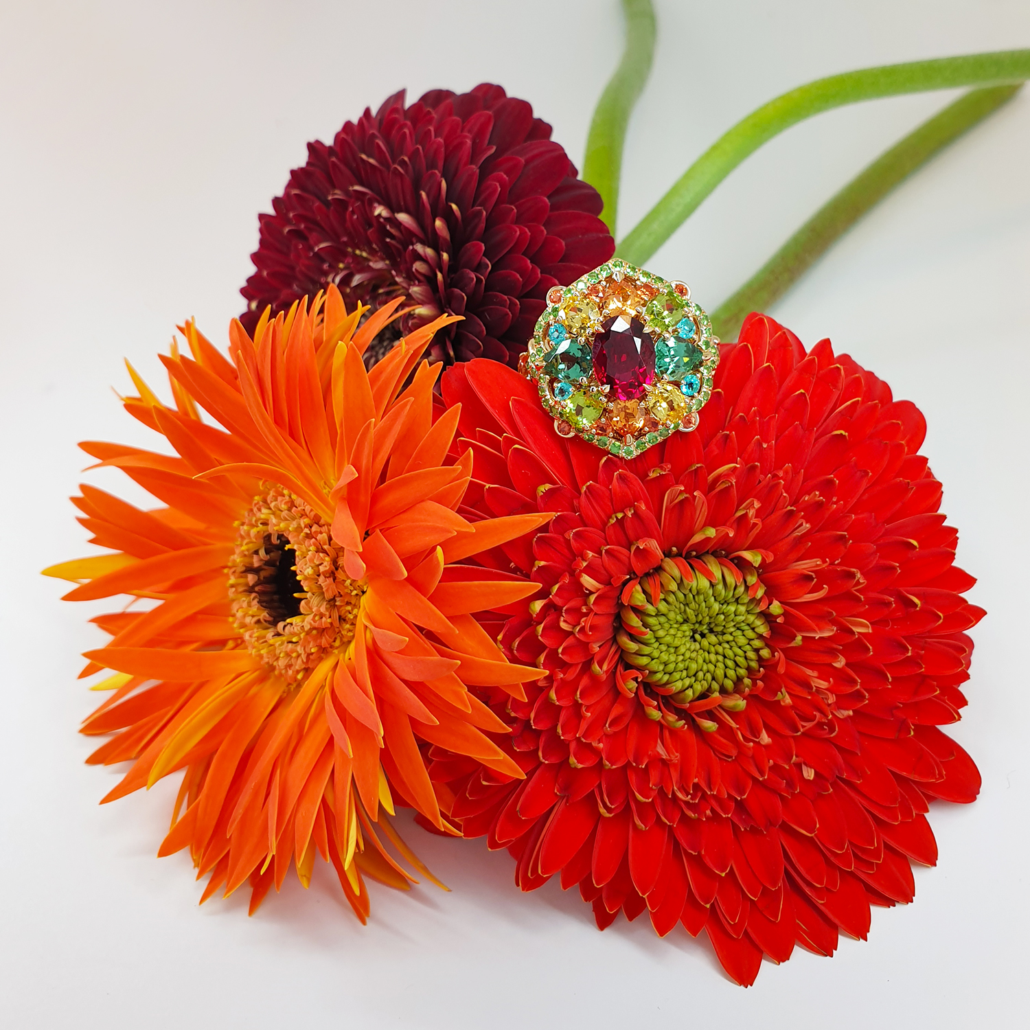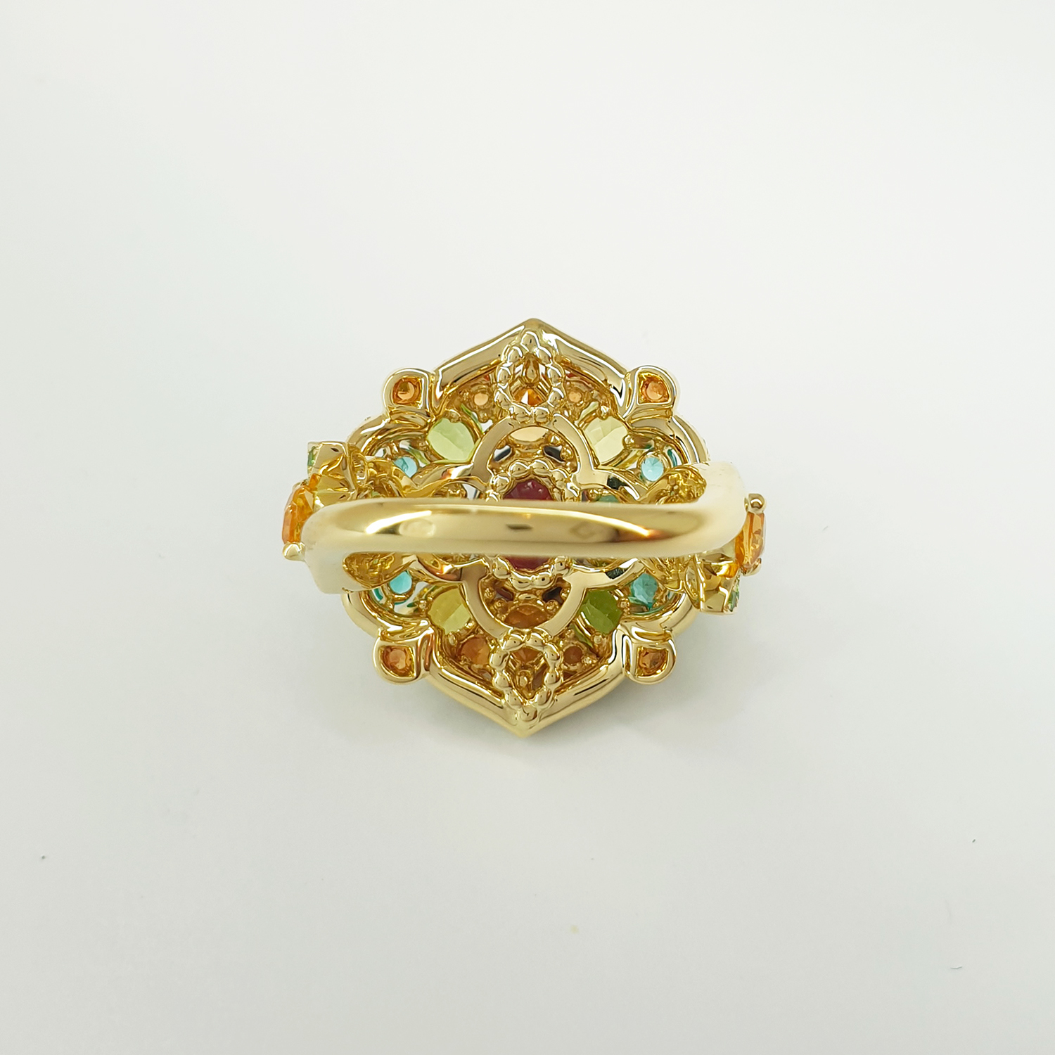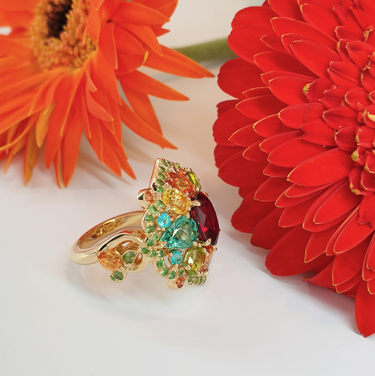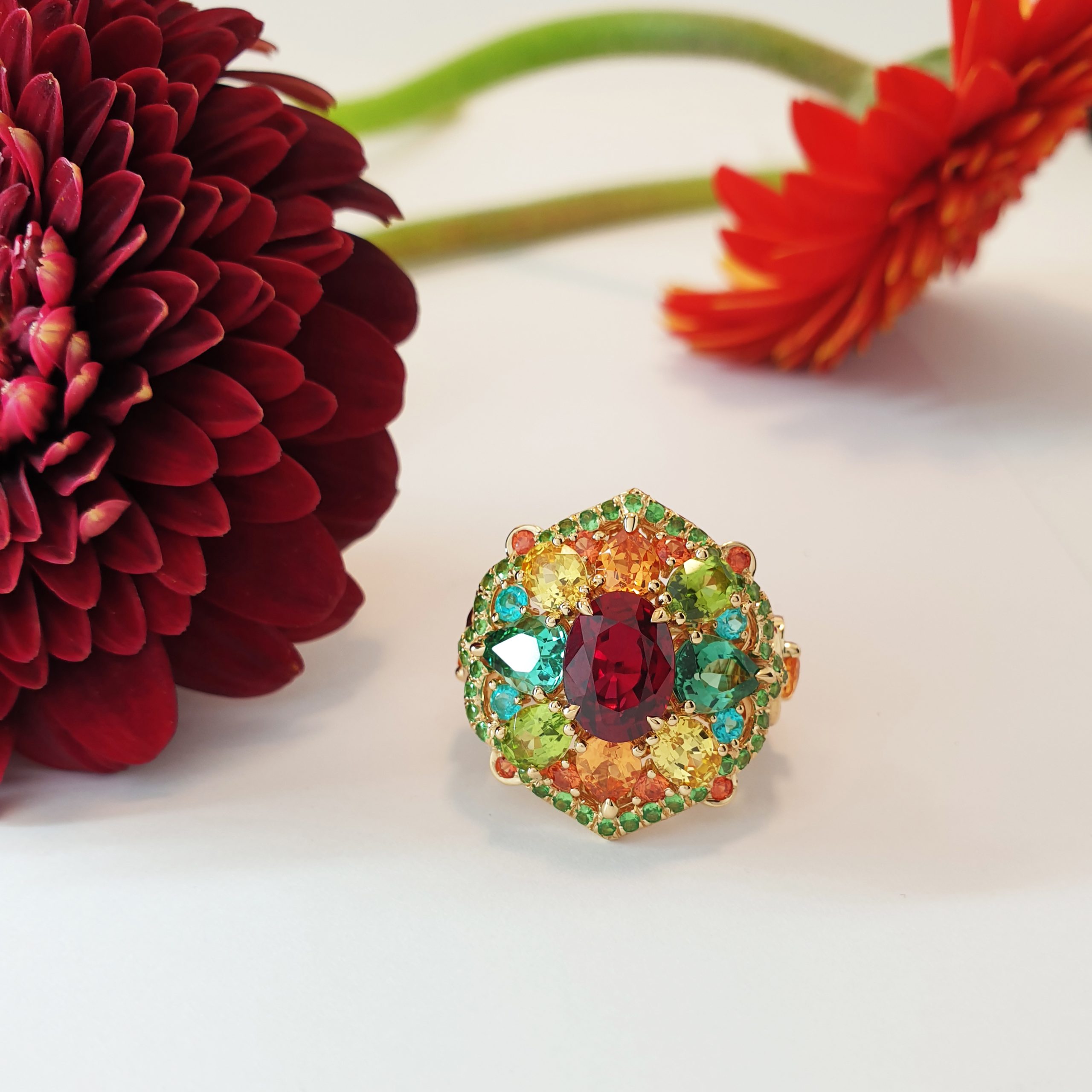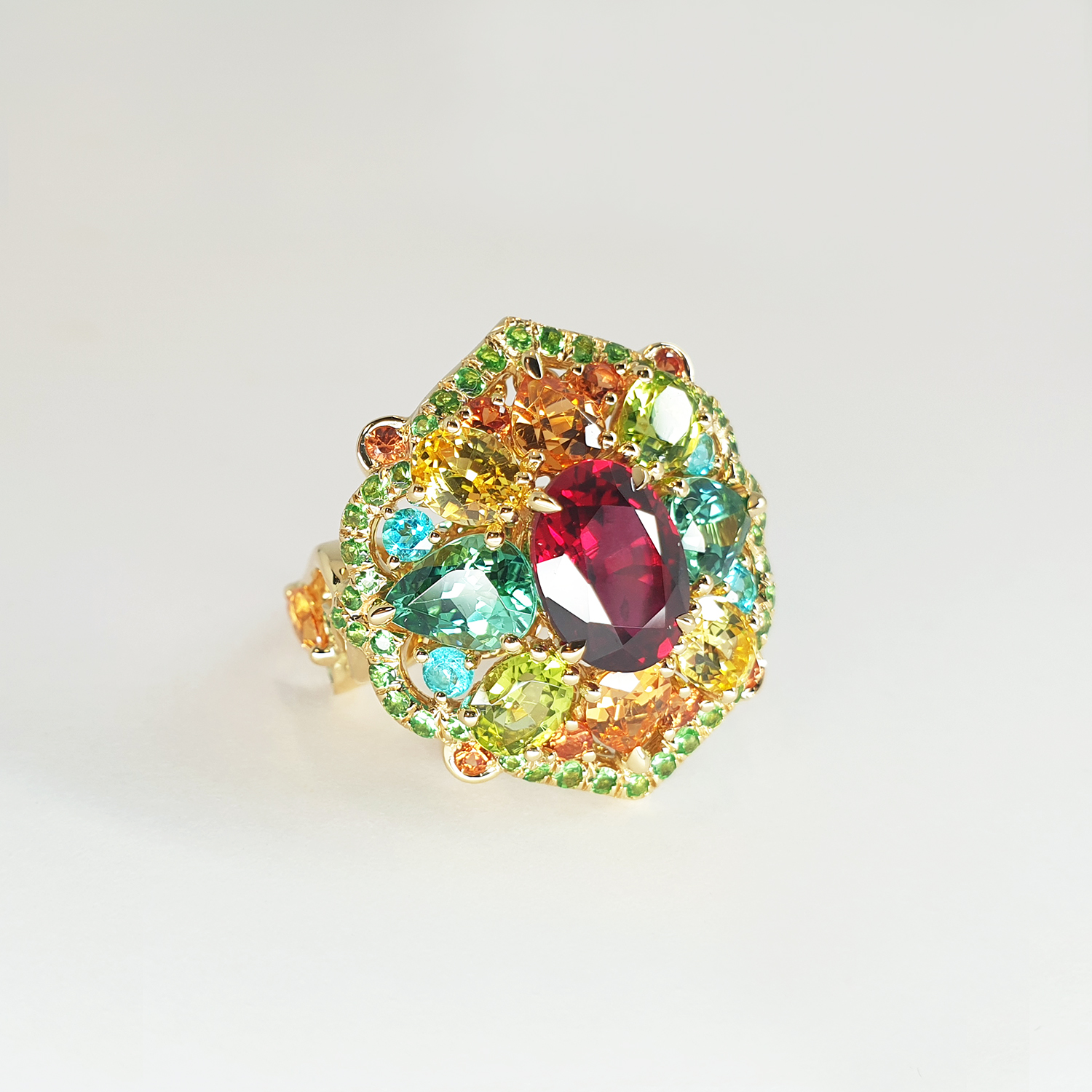 Bague or jaune 750/1000, centre rubis sang de pigeon ovale 2.41 ct. Accompagnement : tourmalines, saphirs jaunes, grenats spessartite, péridots, paraïbas, saphirs orangé et pavage tsavorites.