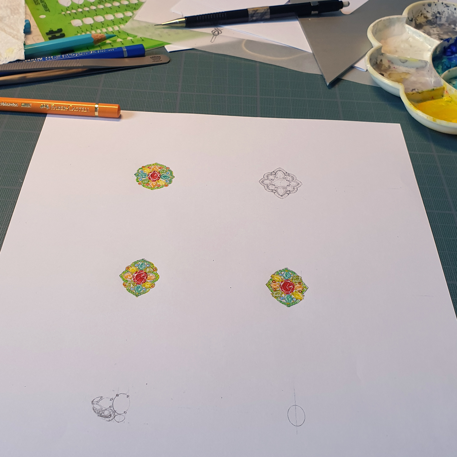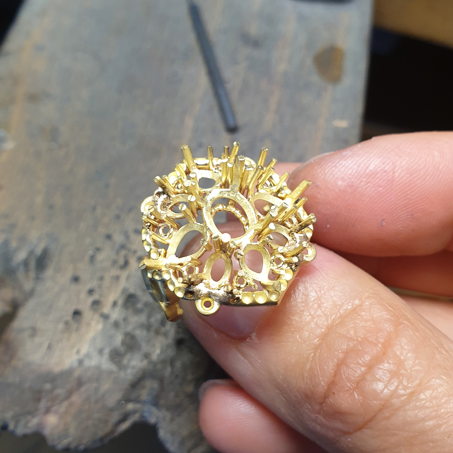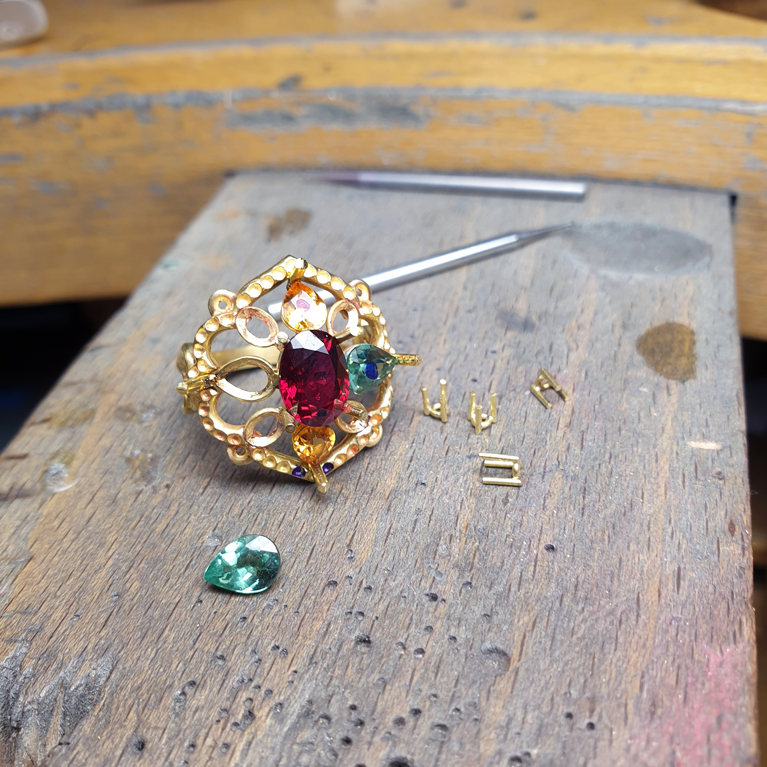Un vrai travail de recherche sur le choix des formes en harmonie avec la palette des pierres précieuses et fines. Un véritable bijou sculpté et façonné totalement à la main aux couleurs vibrantes, révélant l’éclat de ce rubis remarquable. Une richesse jusque dans les détails rappelant les splendeurs de la joaillerie indienne, un souvenir fort de la vie du client.