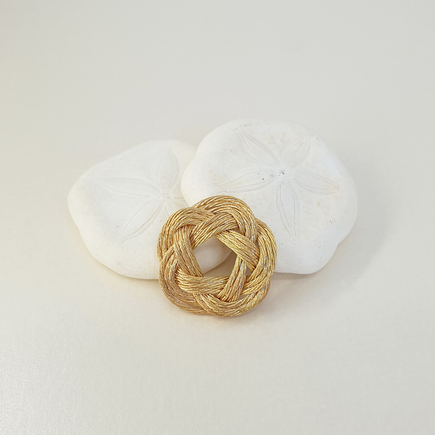 Un pendentif réalisé avec en câble d’or reprenant un motif de nœud marin. La baderne à 5 ganses, comme tous les nouages plats, avait pour fonction de protéger les parties du navire des frottements et des coups répétés des poulies. Tout un symbole pour un pendentif protecteur.